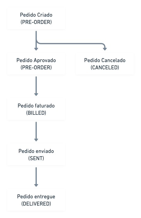 | PRE-ORDER | IN-PROCESSING, PAID, CANCELED | Pedido criado no marketplace, sem confirmação de pagamento nesse status. |